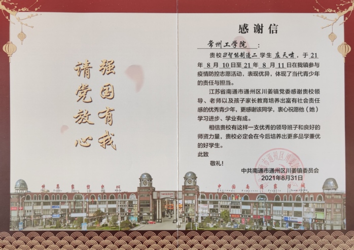 今年暑期,南京、扬州等地爆发新冠肺炎疫情,航飞学院的学子们纷纷主动请缨,踊跃报名成为疫情防控志愿者,积极协助当地政府开展防疫工作。 19级成单二班班长曹岩同学在南京市溧水区晶桥镇陶村社区积极配合当地工作人员,投身核酸检测志愿服务,开展信息登记等相关工作。19级机一班班长马韧哲在泰州市京泰路街道春景社区积极投身抗疫一线,陪同医护人员为居家隔离的居民上门做核酸检测。今年6月刚被组织吸纳为预备党员的王姝元同学,闻令而动、积极响应志愿服务,在徐州市铜山区何桥镇段庄村负责查验行程码和健康码,测量体温与登记。20级飞行班长徐梓耀同学,响应江阴市城东街道杨市社区的号召,认真排查居住社区中、高风险地区来城人员底数情况。值得鼓励的是,21级新生庄天啸同学,更是以较强的社会责任感,受到了当地政府的高度赞扬。