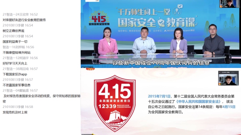 教育部思政司推出的“千万师生同上一堂国家安全教育课”吸引了全院同学线上的广泛参与。北京大学保卫部部长赵冠英,腾讯守护者计划安全专家张文涛,山东大学辅导员薛冰,他们通过生动、真实的案例向高校师生展现维护国家安全的正确行为示范,从网络安全引入,阐述了国家安全面临的新风险、新挑战、总体形势,以及国家安全的重要性,教育引导广大师生树牢总体国家安全观,将国家安全意识转化为自觉行动,生动实践“国家安全,人人有责”。