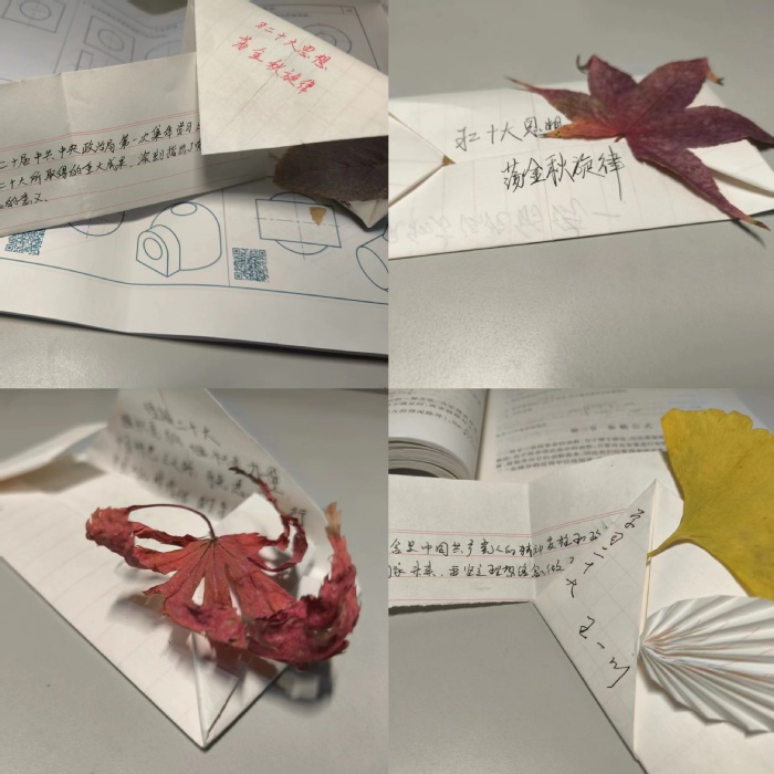 活动伊始,团支书李王昕通过二十大报告金句视频分享带领支部成员展开理论学习并邀请同学上台分享理解和感悟。紧接着,支部成员一起学习如何折信封,并运用自己的创造力与想象力对其进行设计与装饰。随后,将自己对党的二十大的理解和对祖国的热爱都写进信里留给未来的自己,让其在未来的生活中不断提醒自己奋发向上,同时保留一份对自己青年时期思想与感悟的怀念。