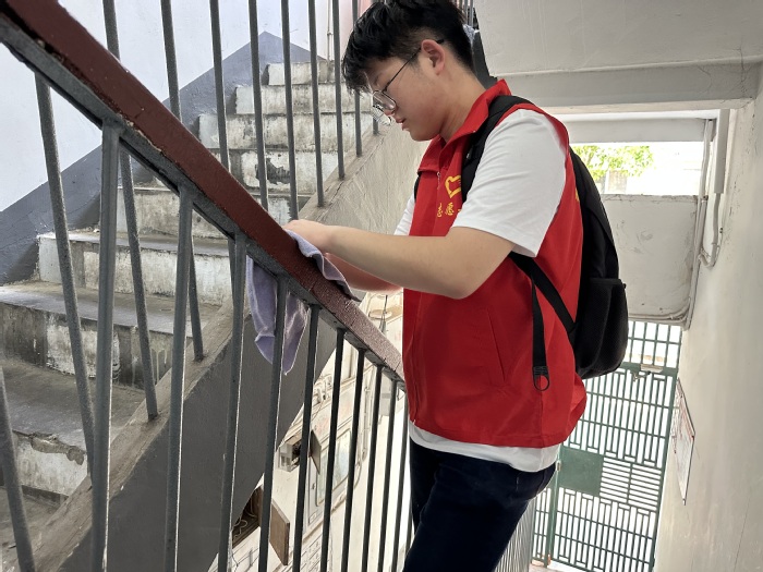 劳动教育进社区。活动前,班级团支部与钟楼区清潭第五社区进行了志愿活动对接。5月18日,在社区工作人员的指引下,支部同学分工明确,配合默契,对社区内部分楼道进行擦拭和打扫,将被随意丢弃的垃圾进行了处理,并主动对儿童游乐区进行清洁。尽管天气炎热但大家热情不减,社区工作人员对同学们的亮眼表现表示高度肯定。